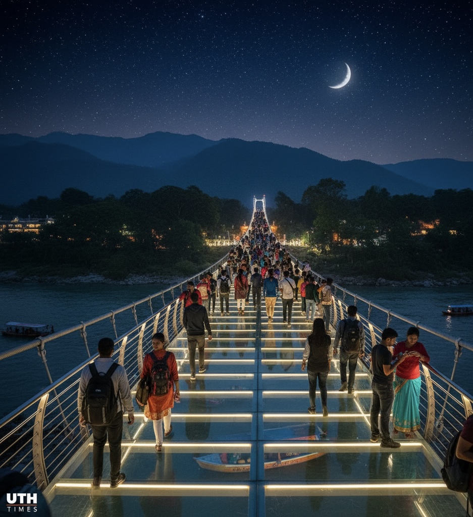 Tourists, adventure seekers, and devotees alike will find themselves mesmerized by its transparent floor — offering a 360° view of Rishikesh’s landscape, from the emerald forests to the distant peaks. At night, illuminated LED panels along the cables transform Bajrang Setu into a glowing ribbon of light over the sacred Ganga — a sight destined to become Rishikesh’s new identity.