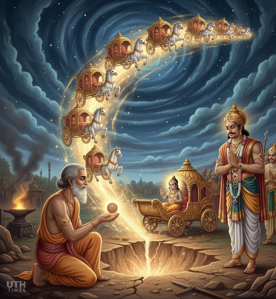 A humble Brahmin, sent by fate, visited Aja’s court. When offered gold, he refused, asking only for what truly belonged to the king. That night, Aja earned a single copper coin through labor at a blacksmith’s forge and gifted it to the Brahmin’s wife.