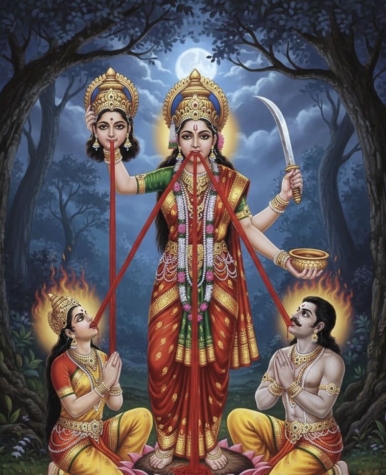 ⚔️ She stands decapitated, holding her own severed head while three streams of blood nourish her attendants and herself.