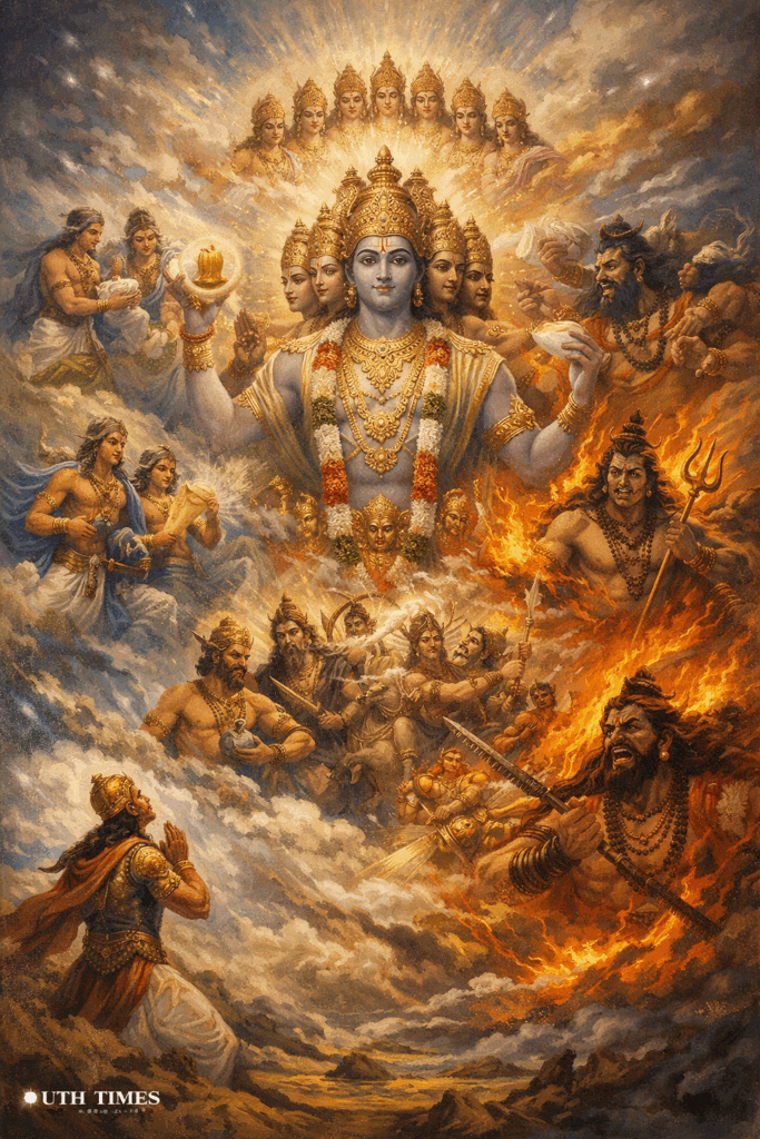 On the battlefield of Kurukshetra, time did not merely pause—it dissolved. When Arjuna asked to see the true form of Krishna, he was not prepared for what followed. The Vishwaroopam was not a form—it was existence itself, revealed without limits.